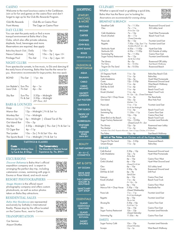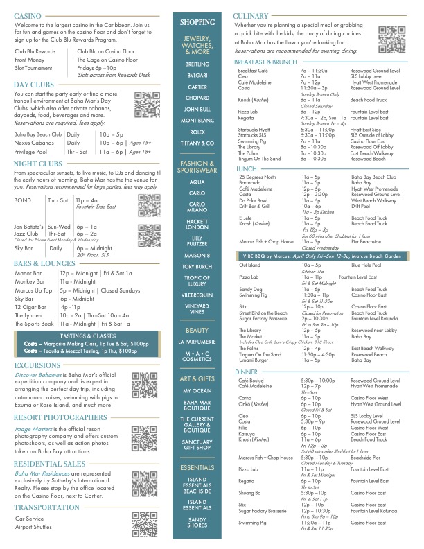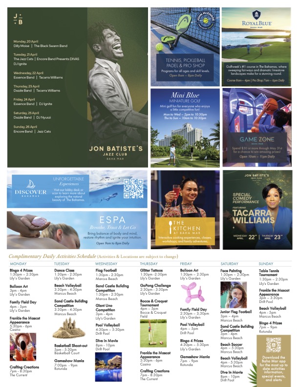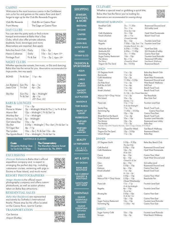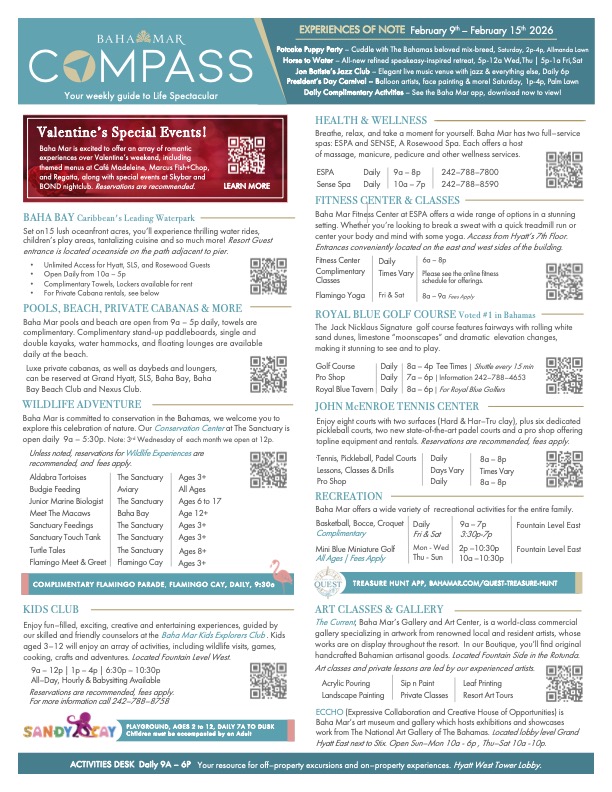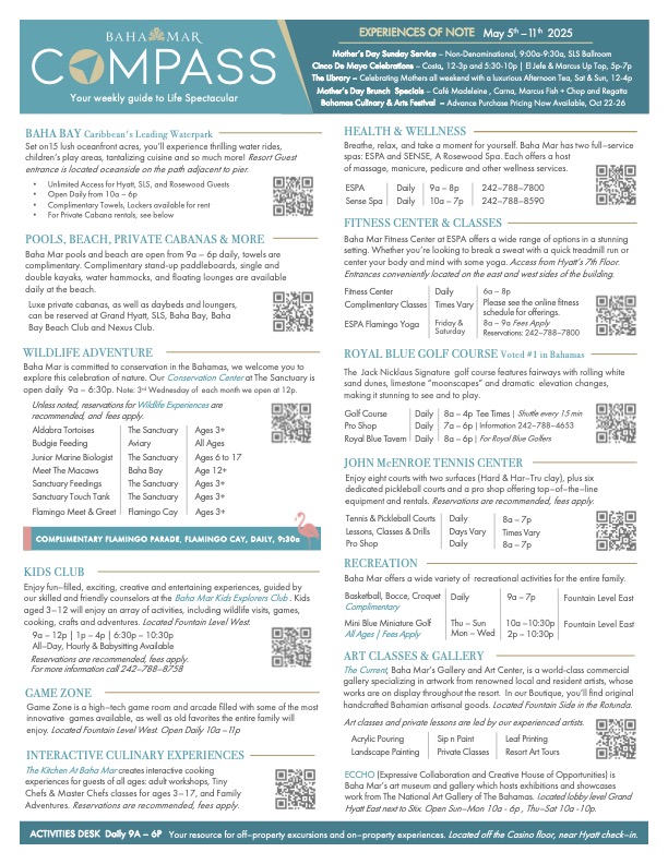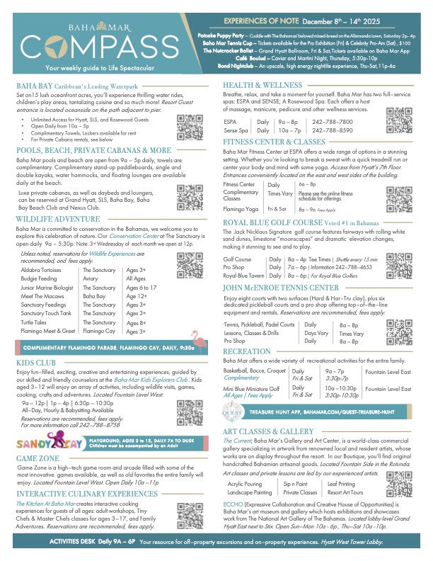 Baha Mar’s weekly activity guide, Compass, provides the most up to date information for the sweeping array of activities, amenities and experiences available during your stay at the resort.